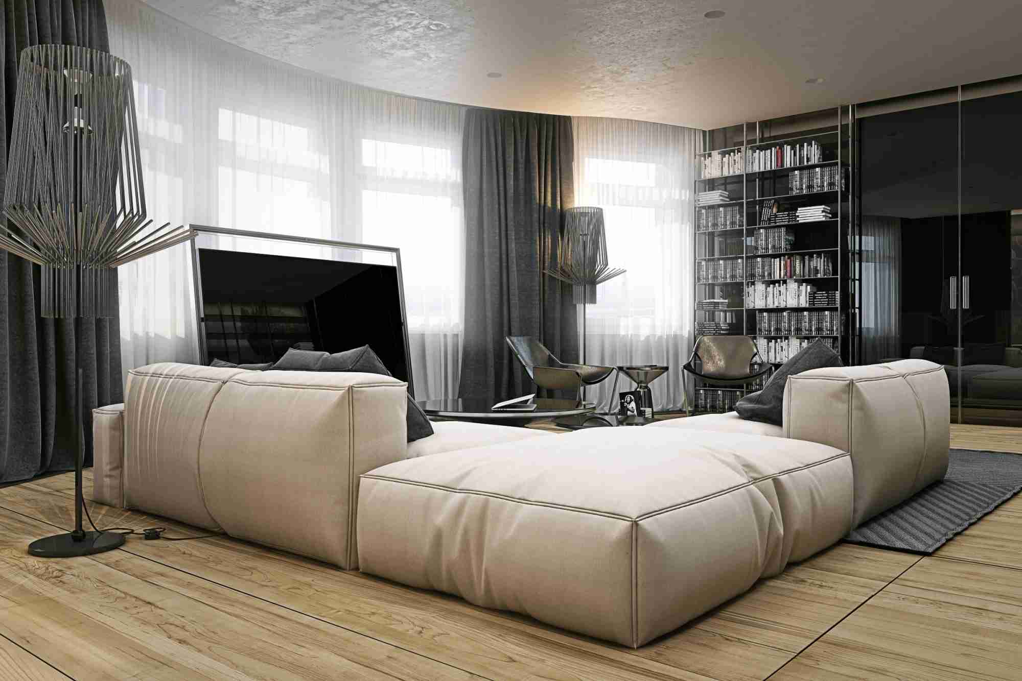 整面墙本身就是一个强大的收纳空间,大小不一的收纳格组成实用的墙面,同时还有很不错的设计感,电视就放在墙面中间,黑白色的搭配很容易就让电视背景墙凸显出来。